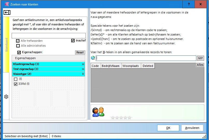 - Combinatie met zoekwoorden: - De eigenschappenfilter werkt los of in combinatie met zoekwoorden. Als je geen zoekterm opgeeft, krijg je alle klanten met de geselecteerde eigenschappen. Vul je wel iets in, dan wordt binnen het zoekresultaat gefilterd op de eigenschap.
