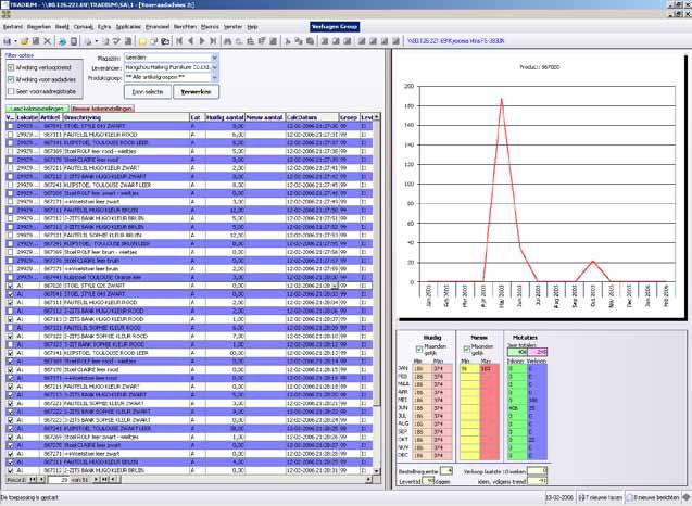 Aan de hand hiervan worden de inkoop- en productmanager(s) niet alleen tijdig geïnformeerd over de noodzaak van het aanvullen van de voorraad (Besteladvies); wanneer een specifiek product ‘booming’ wordt of als juist de verkoop inzakt, signaleert TRADIUM dat direct aan alle betrokkenen. De grenswaarden hiervoor bepaalt u zelf per productgroep. Ook kunt u elk productgroep afzonderlijk aan één of meerdere productmanagers toewijzen.