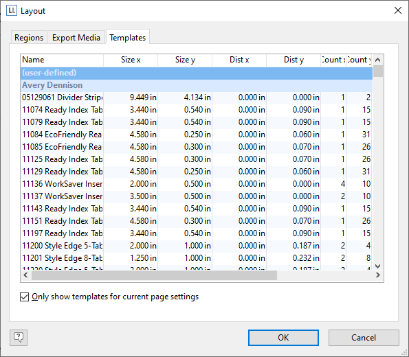 4. Select a label format via Project > Layout Regions (Project > Page Setup). In the "Templates" tab, choose the template that you want from the predefined label formats of various manufacturers. This specifies automatically the size of the individual labels, how many are to appear on the sheet and how they are to be distributed. You will find more information about this in the chapter Templates for Label Formats.