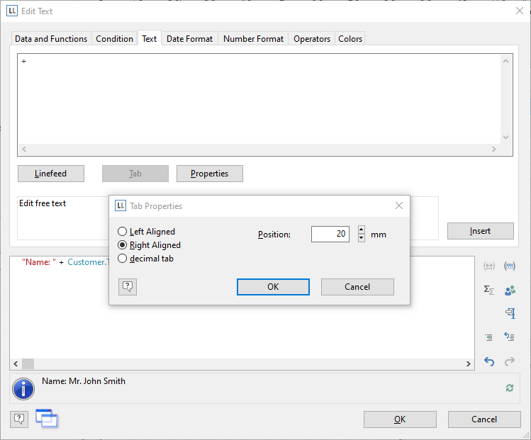 With the "Text" tab, you can insert free text in your expression, set tab stops and page breaks.