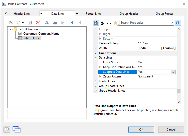 5. Back in the table dialog, select the table "Orders" and set the table property "Data rows > Suppress data rows" to "Yes".