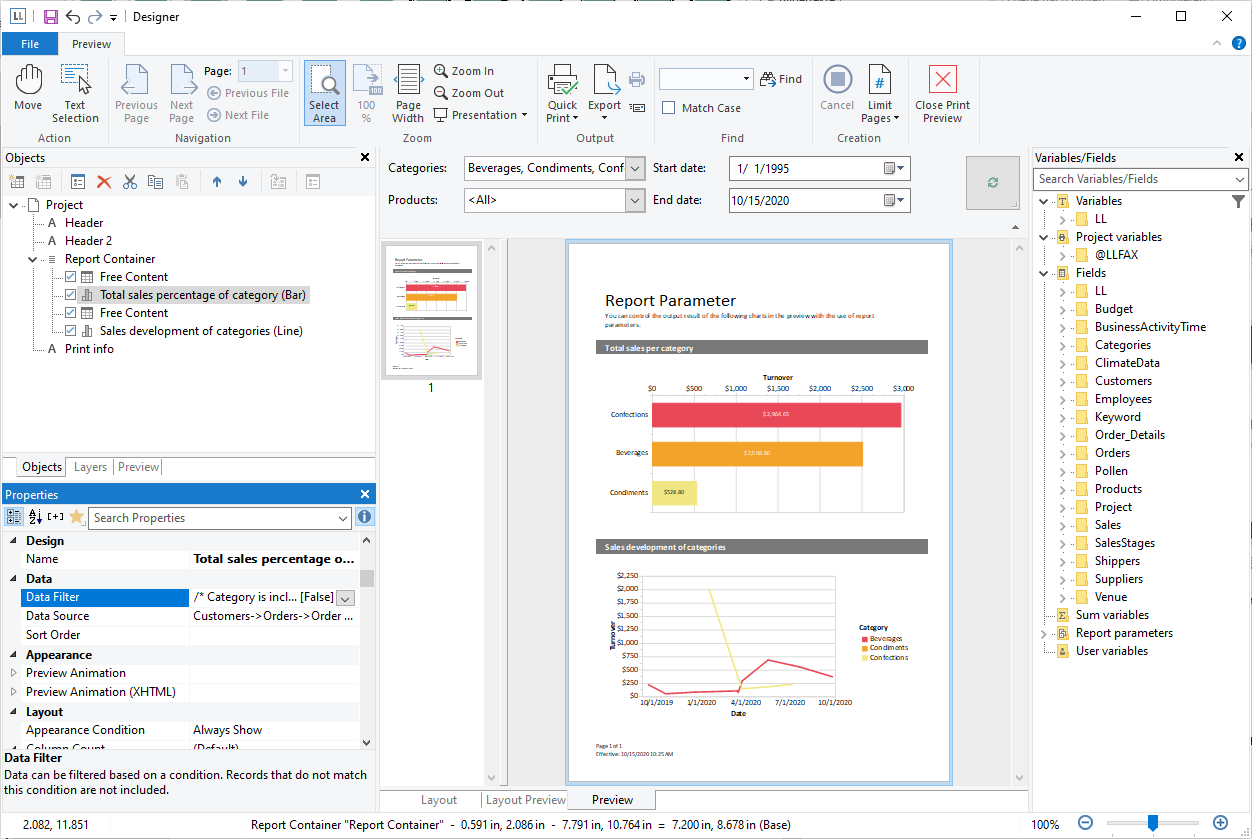 7. When printing to preview, the parameters can then be configured as desired - the report will be filtered according to categories and date: